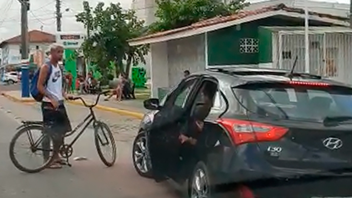 Quando percebeu o “obstáculo”, o ciclista desceu do veículo e quase caiu no chão. O Hyundai/I30, que aparece na gravação, possui placas de Curitiba/PR e parou sobre a ciclofaixa, impedindo a passagem da bicicleta.