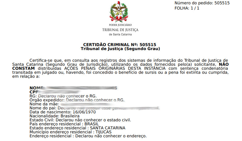 Em contato com o VipSocial, o responsável pela empresa enviou cópias dos documentos que comprovam a ficha limpa do foragido, em Santa Catarina, o que fica contraditório com o registro do apenado no estado gaúcho. O proprietário da empresa de vigilância explicou que não tem como empresas ou pessoas comuns, ter acesso a esse tipo de informação.