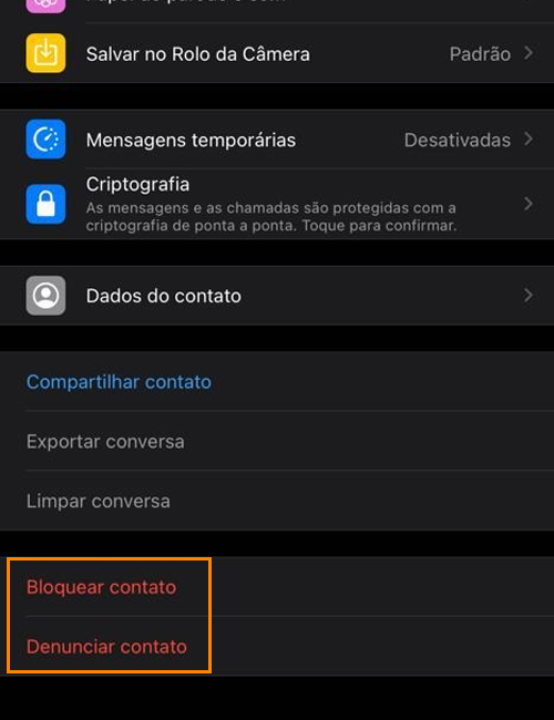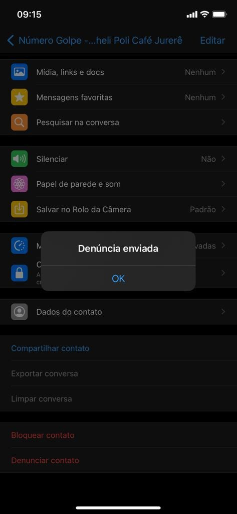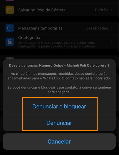 Micheli pede para quem receber mensagens denunciem o contato nas configurações da conversa. Quanto mais denúncias, a rede de mensagens entende que se trata de um golpe.