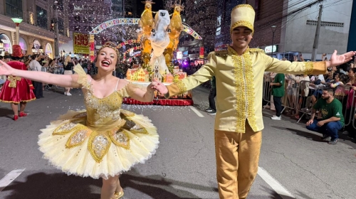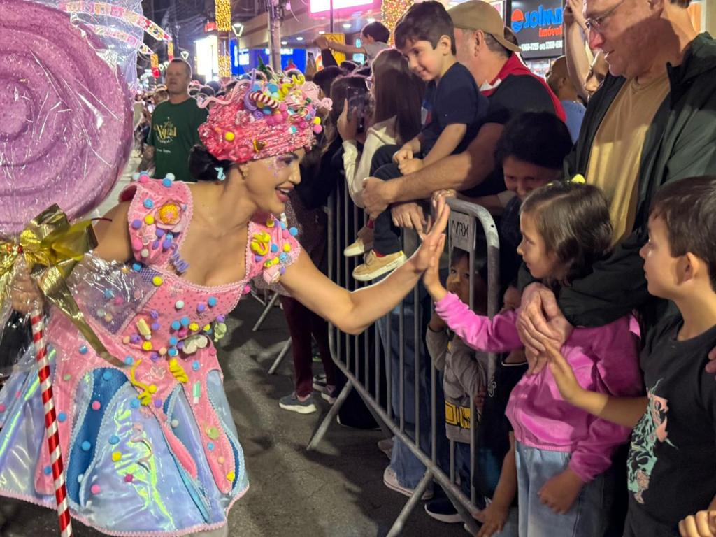 A Comissão de Frente abriu o cortejo, com bailarinos e personagens como a Bailarina, o Duende e o Soldado, estabelecendo o clima mágico da apresentação. Ao longo do percurso, o público acompanhou alas como Anjos Gigantes, o Presépio Vivo formado pelas paróquias Cristo Rei e Santo Antônio, a Ala das Famílias em Pijamas Xadrez, a Banda Municipal caracterizada como soldadinhos, além de representações de presentes, bonecos de neve, doces, bonecas, ursos polares e duendes de mochila. A ala “Você é o Presente”, da Companhia de Dança Moviarte, também ganhou destaque, junto à chegada do Papai Noel.