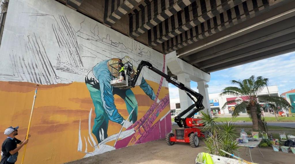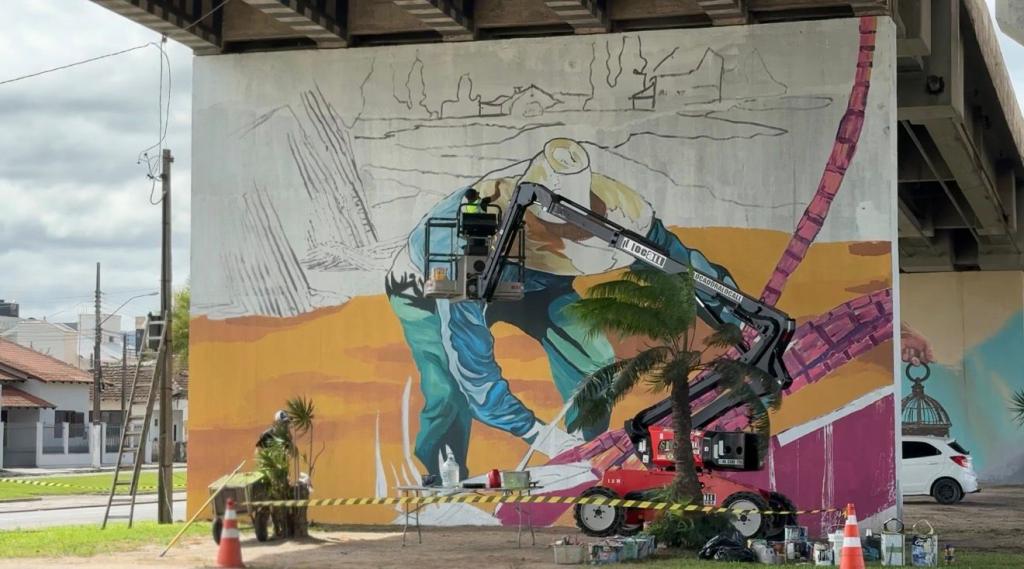 A pintura artística da estrutura está sendo executada pela equipe do Studio981, responsável pela criação e aplicação dos murais que passam a colorir os pilares e paredes sob a ponte. O trabalho inclui intervenções de arte urbana inspiradas em elementos da história, da cultura e das tradições de Tijucas, contribuindo para transformar o espaço em um ponto visual mais atrativo na entrada da cidade.