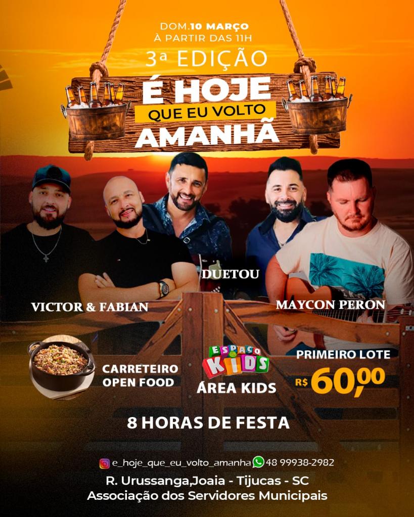 ATENÇÃO: A expectativa está grande para a chegada do dia 10 de março. Vai acontecer em Tijucas mais uma edição da festa "É Hoje Que Eu Volto Amanhã"! Com um lineup diferenciado, os organizadores conseguiram unir gastronomia, diversão e boa música em um só lugar.
