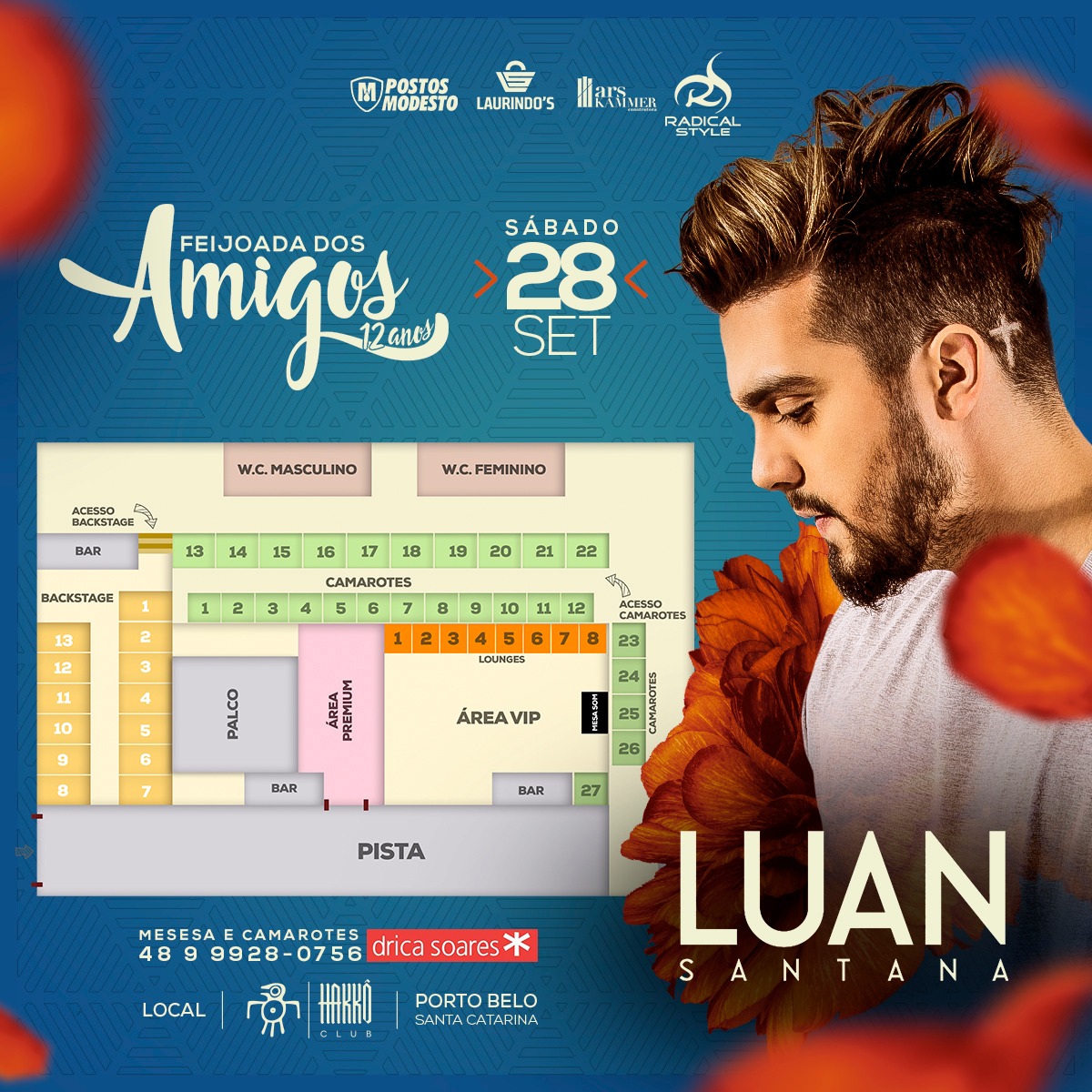 O nome do cantor vem para fortalecer ainda mais o nome da festa. A partir de hoje, quem tiver interesse em fazer reservas já pode entrar em contato através do telefone (48) 99928-0756 com Drica Soares . Em breve será divulgada a data de lançamento da venda de ingressos.