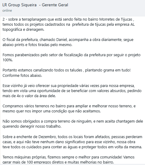 Em resposta, a empresa LR Group esclareceu que todas as obras de terraplanagem realizadas no bairro estão devidamente cadastradas e aprovadas pela Prefeitura de Tijucas, por meio da empresa AL Topográfica e Drenagem.