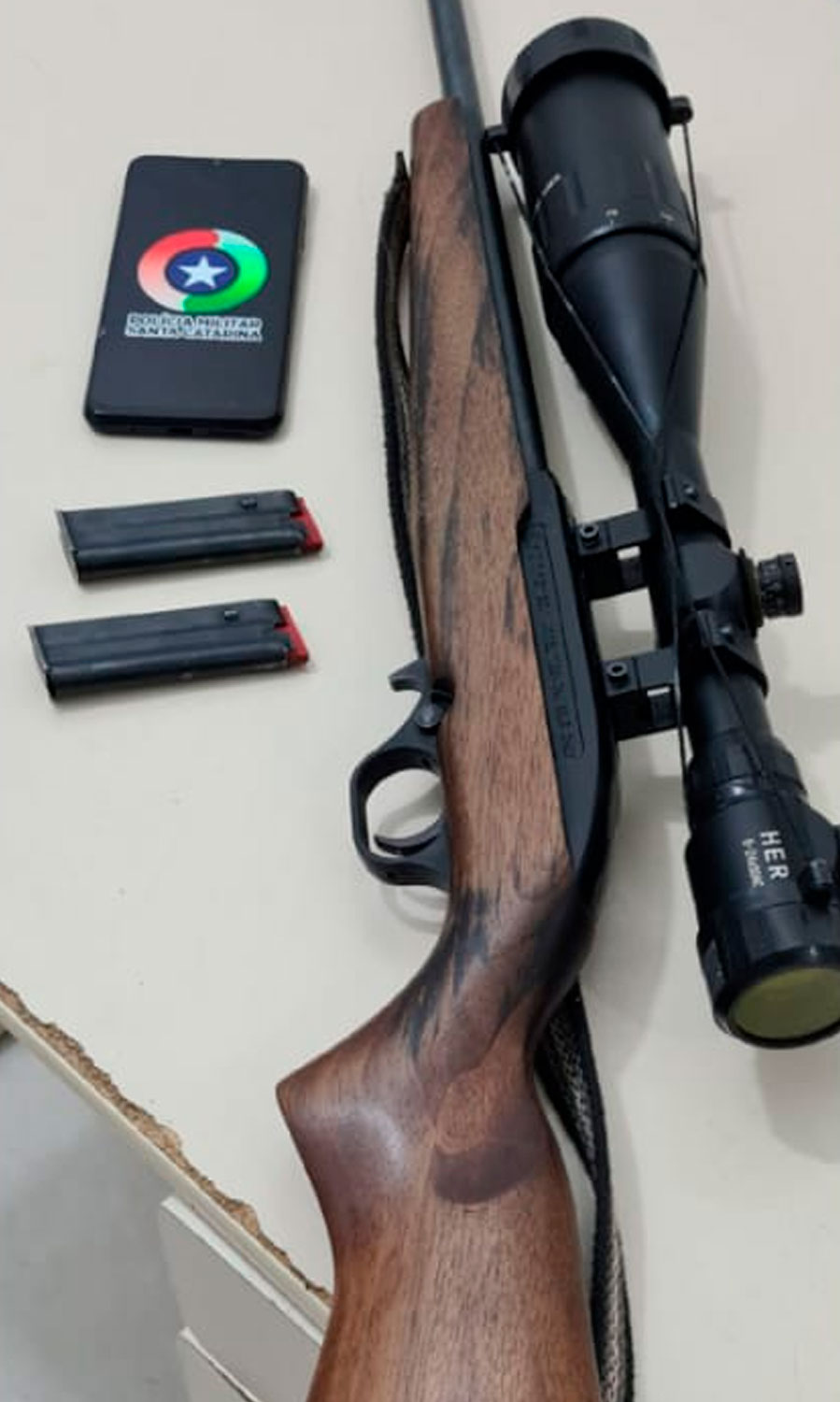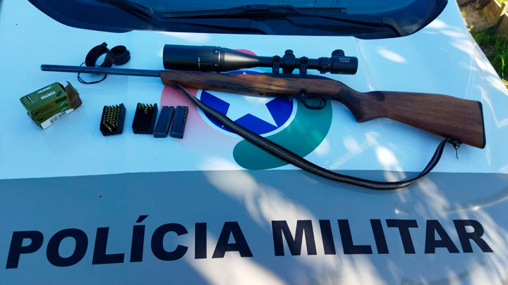 Foi conversado com o pai do autor que informou ter pego a arma do filho e escondido em outro lugar. O homem pegou a espingarda calibre .22 mais 72 munições intactas e dois carregadores do esconderijo, que ficava no bairro Perequê, em Porto Belo e entregou para a guarnição. A arma tinha registro no nome do autor das ameaças.