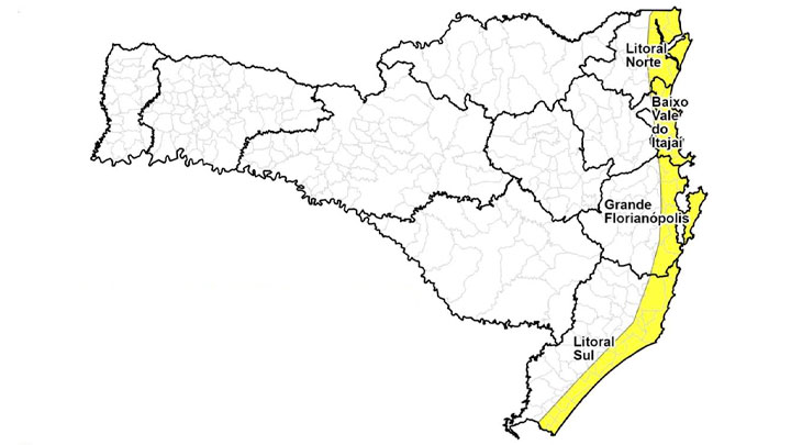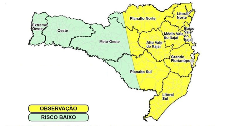 A estimativa é que os acúmulos de chuva cheguem a 70 milímetros, trazendo riscos de alagamentos e deslizamentos na parte amarela do mapa.