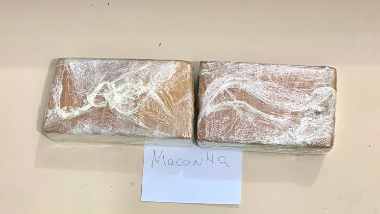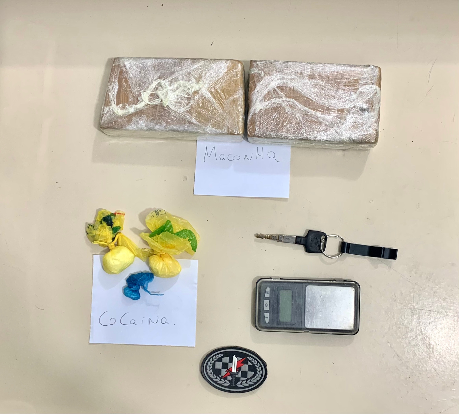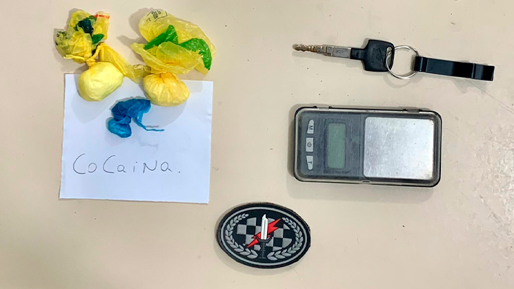 Em revista pessoal, foi localizado em seu bolso a chave da motocicleta e uma "case", portanto 03 buchas grandes de cocaína embaladas, pesando aproximadamente 25 gramas. Já na mochila, foram encontrados dois tabletes grandes de maconha pesando aproximadamente 690 gramas no total e uma balança de precisão.