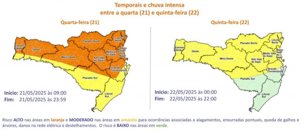 Uma frente fria trará chuva intensa e temporais para Santa Catarina a partir desta quarta-feira, 21 de maio, estendendo-se até a quinta-feira, 22. As condições climáticas adversas são esperadas principalmente entre a tarde e a noite desta quarta, afetando o Grande Oeste, todo o Vale do Itajaí, parte da Grande Florianópolis, Planalto Norte e Litoral Norte.