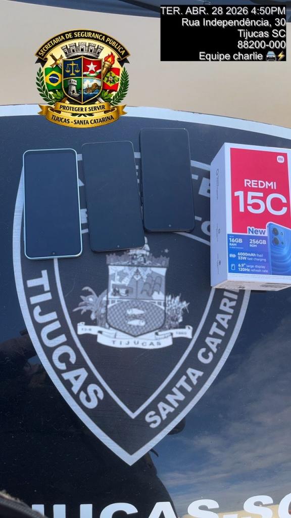 Durante as buscas nas imediações, uma das suspeitas foi localizada e abordada nas proximidades do estabelecimento afetado. Enquanto ela estava com três dos aparelhos furtados em sua posse, a sua parceira fugiu em um carro branco conduzido por um terceiro indivíduo não identificado.