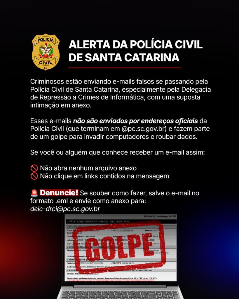A Polícia Civil de Santa Catarina emitiu alerta sobre uma nova modalidade de golpe virtual que utiliza e-mails falsos enviados em nome da instituição. As mensagens simulam intimações policiais, com foco em supostos crimes de informática, e incluem arquivos anexos ou links maliciosos com o objetivo de invadir dispositivos e capturar dados pessoais das vítimas.