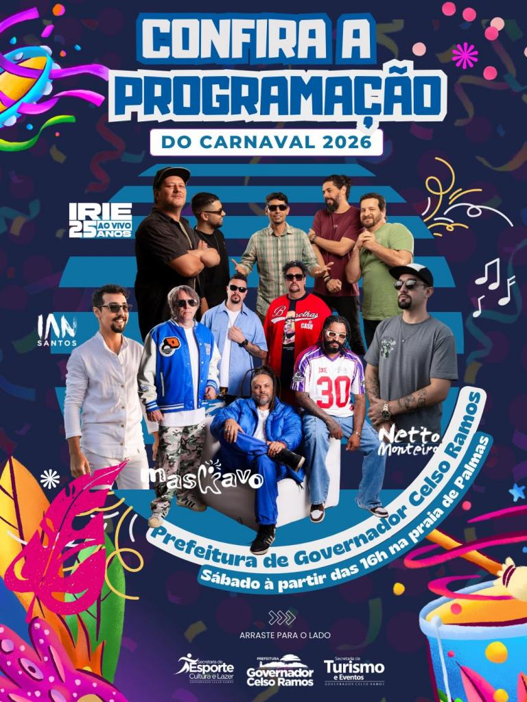 A Prefeitura de Governador Celso Ramos divulgou as atrações do Carnaval 2026, que será realizado entre os dias 14 e 16 de fevereiro. No sábado e no domingo, a programação começa às 16h, enquanto na segunda-feira tem início às 19h.