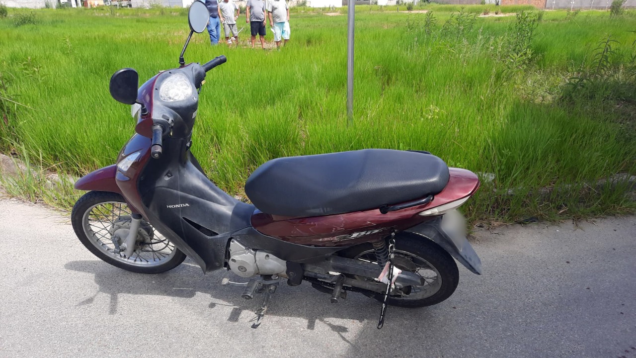 A condutora da Biz ficou embaixo do caminhão, mas conseguiu arrastar o seu corpo para fora e teve apenas leves ferimentos na perna e nos pés.