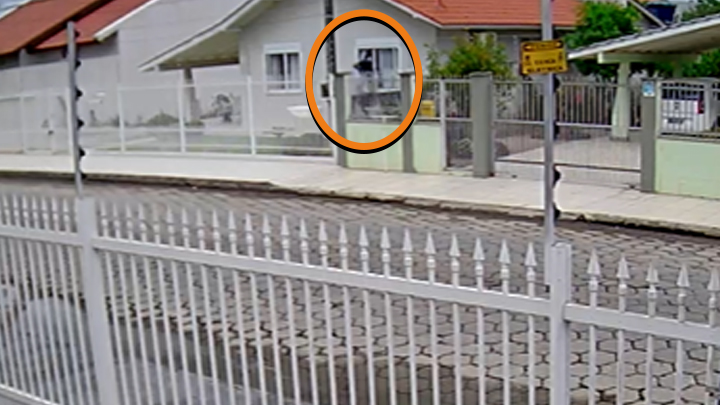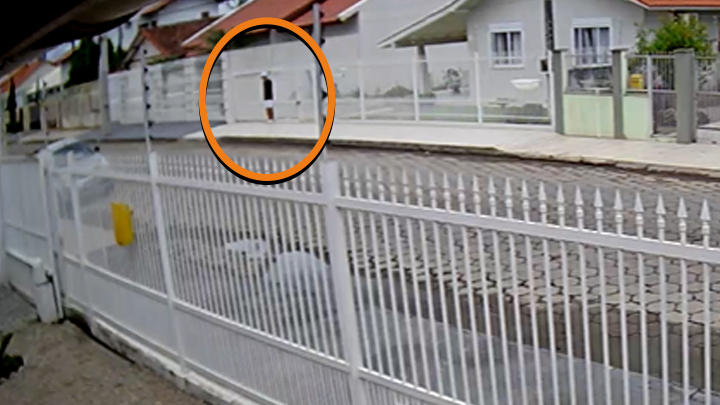 Ele passa em frente a um dos imóveis, anda mais alguns metros e retorna. O criminoso se aproxima do portão e consegue desencaixá-lo, permitindo sua abertura. Dentro do terreno, ele ronda a casa e consegue acessar o seu interior através de uma janela.