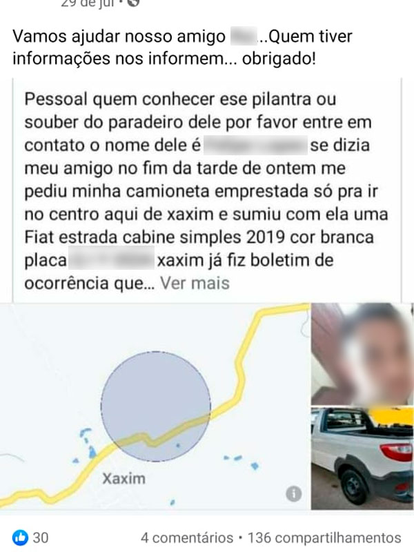 A placa do veículo foi anotada e repassada para a guarnição. Em contato com o proprietário, morador de Xaxim, foi descoberto que ele havia emprestado seu carro para um amigo e o rapaz desapareceu com o automóvel.