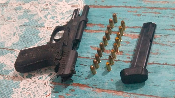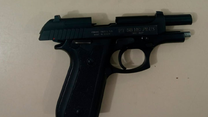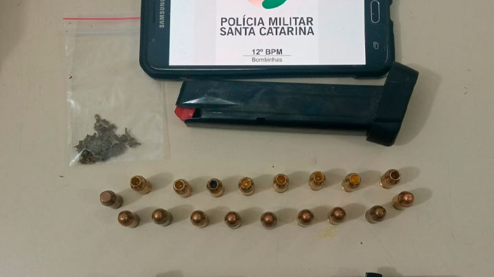 O homem foi localizado pela guarnição e foi preciso uso da força para imobilizá-lo. Ele negou ter a arma, porém ao fazer uma busca em sua casa a pistola calibre 380 com 18 munições intactas foi encontrada embaixo do sofá. Também foram apreendidos entorpecentes. O homem foi levado para a delegacia.