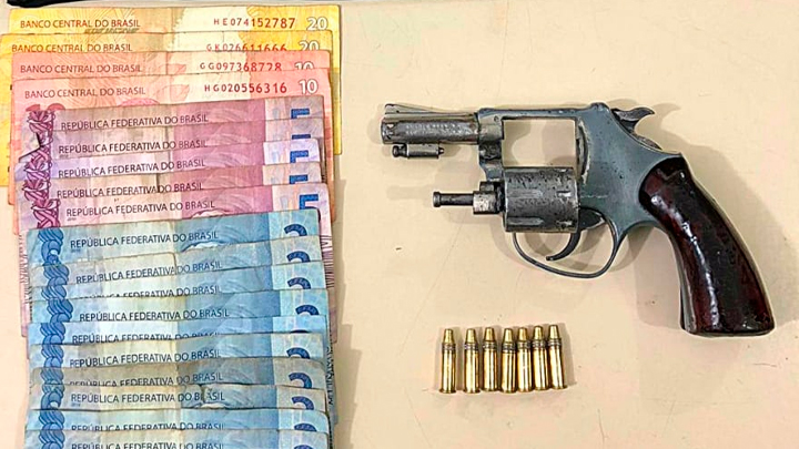 O suspeito foi abordado na rua 454. Antes tentou fugir. Em sua cintura havia uma arma de fogo calibre .22 com 07 munições intactas. Foram encontrados também R$111 em dinheiro.