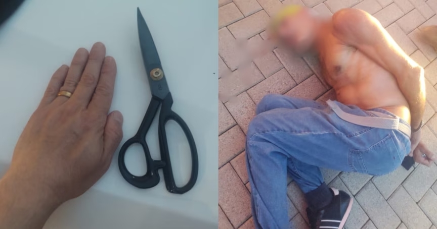 O homem ainda tentou fugir a pé. Após ser acompanhado por cerca de 150 metros, foi alcançado e novamente contido, momento em que sacou uma tesoura e avançou contra um dos policiais. A força foi empregada uma segunda vez para neutralizar a ameaça. Mesmo imobilizado, o autor resistiu à algemação.