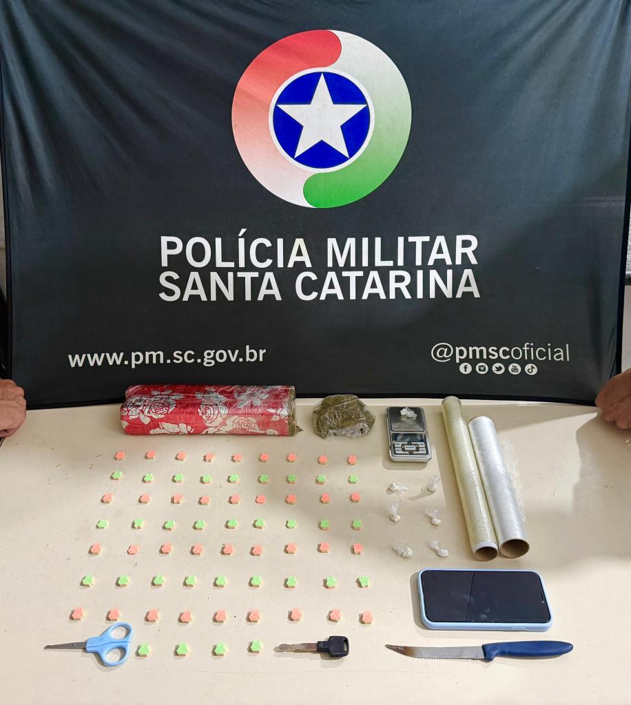 Com ele, foram apreendidos comprimidos de ecstasy, porções de cocaína e maconha, uma balança de precisão, materiais para fazer o fracionamento dessas drogas e um celular.