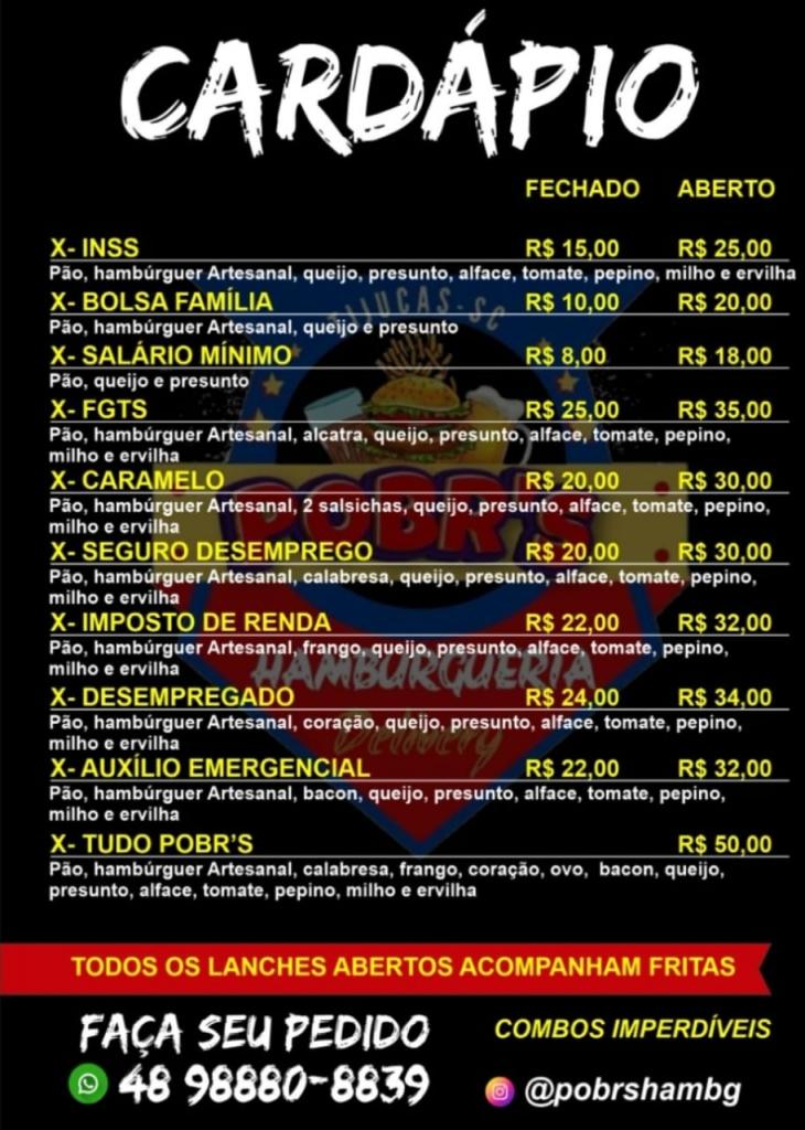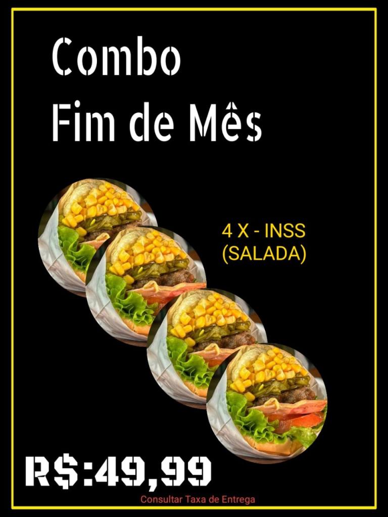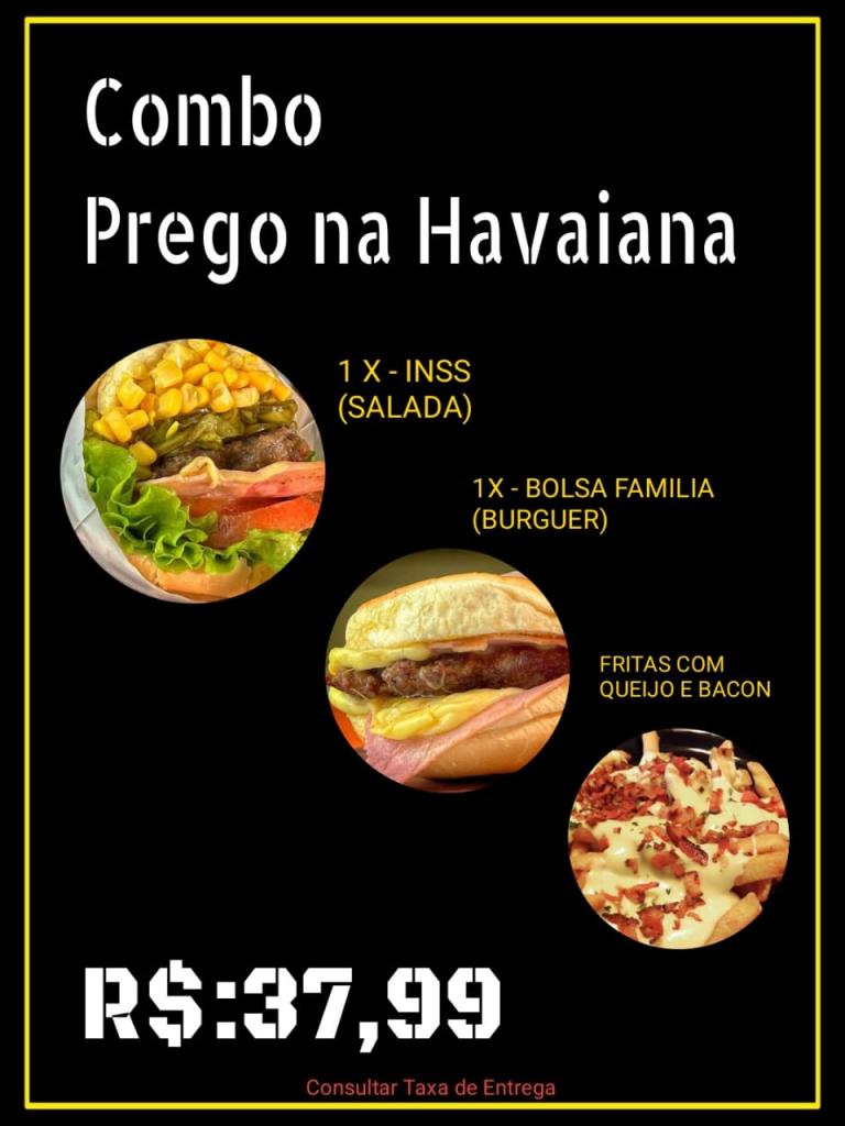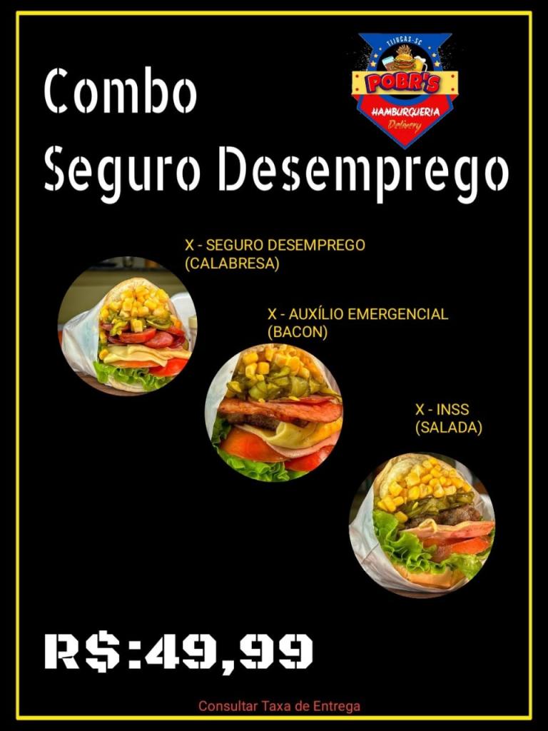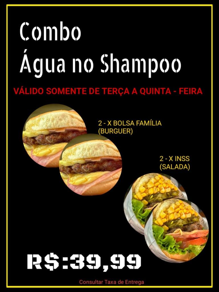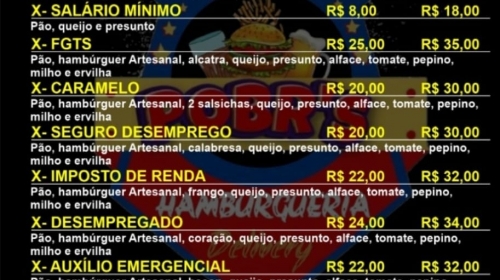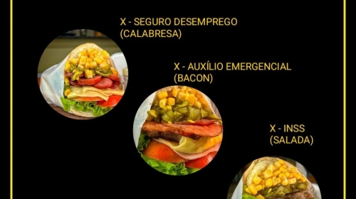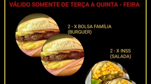 Pra aguçar o paladar tem o ‘Combo Assalariado’, com filé duplo e acompanhamentos, e acompanha de brinde a Coca-Cola 2 litros. Já o Combo SUS vem um X-INSS e de brinde a batata frita. O mês tá só começando, mas está duro? Sem problemas. O Combo Fim de Mês resolve tudo. São quatro X-INSS deliciosos.