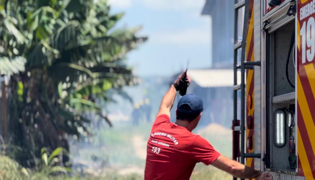 Bombeiros de Tijucas tiveram trabalho para controlar as chamas de um incêndio que rapidamente se propagou no início da tarde desta quarta-feira, 27 de dezembro.
