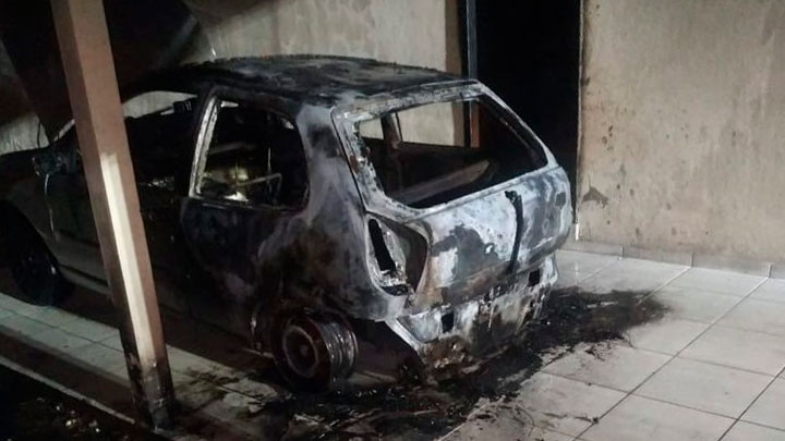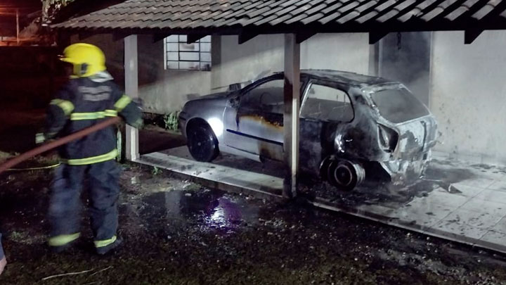 Um veículo Fiat/Pálio estacionado na garagem da casa estava sendo consumido pelo fogo. Foram precisos 2 mil litros de água para extinguir as chamas. O automóvel ficou completamente destruído.