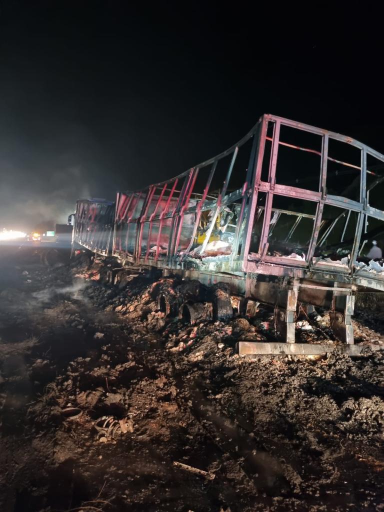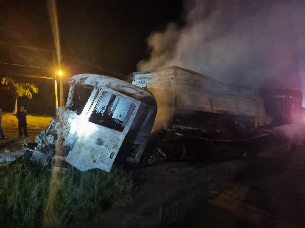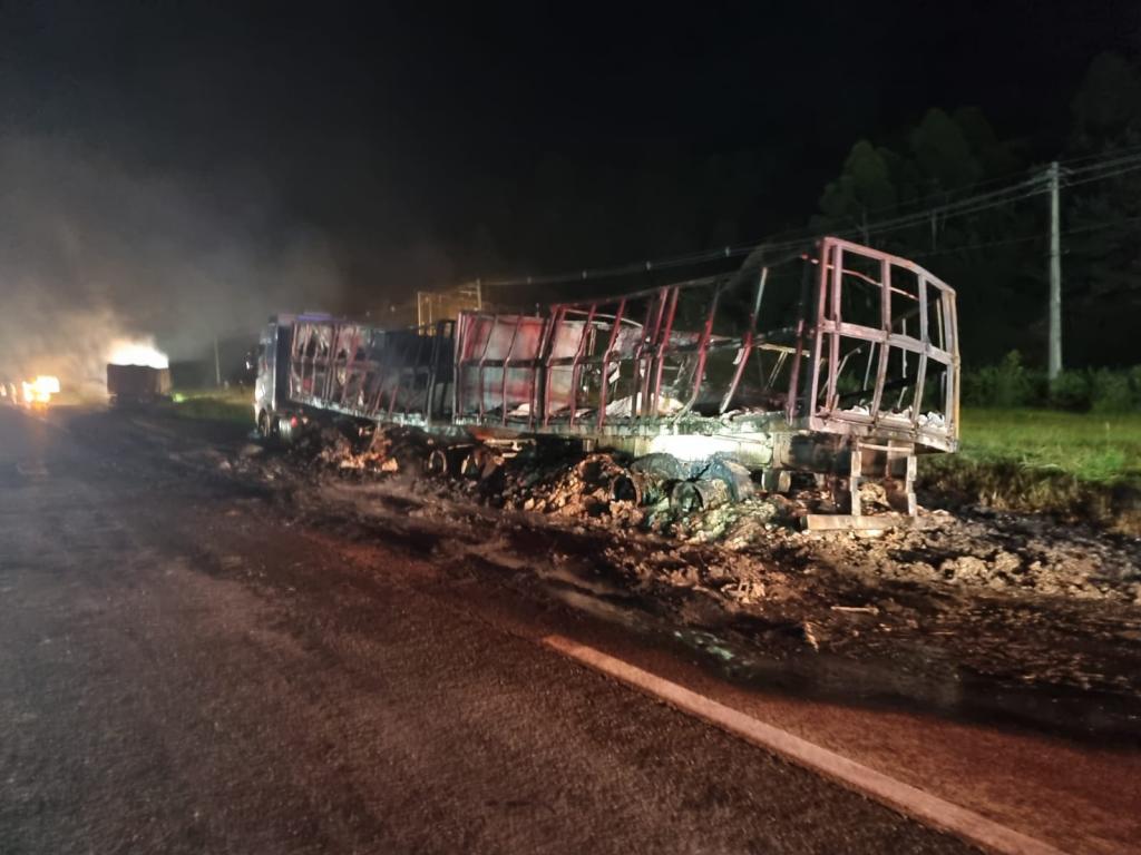 Uma das carretas transportava açúcar, enquanto a outra carregava sucata metálica. O veículo que seguia na retaguarda foi encontrado totalmente tomado pelas chamas, com comprometimento do compartimento de carga e do tanque de combustível. Já a carreta posicionada à frente apresentava incêndio restrito ao compartimento de carga, com o cavalete preservado.