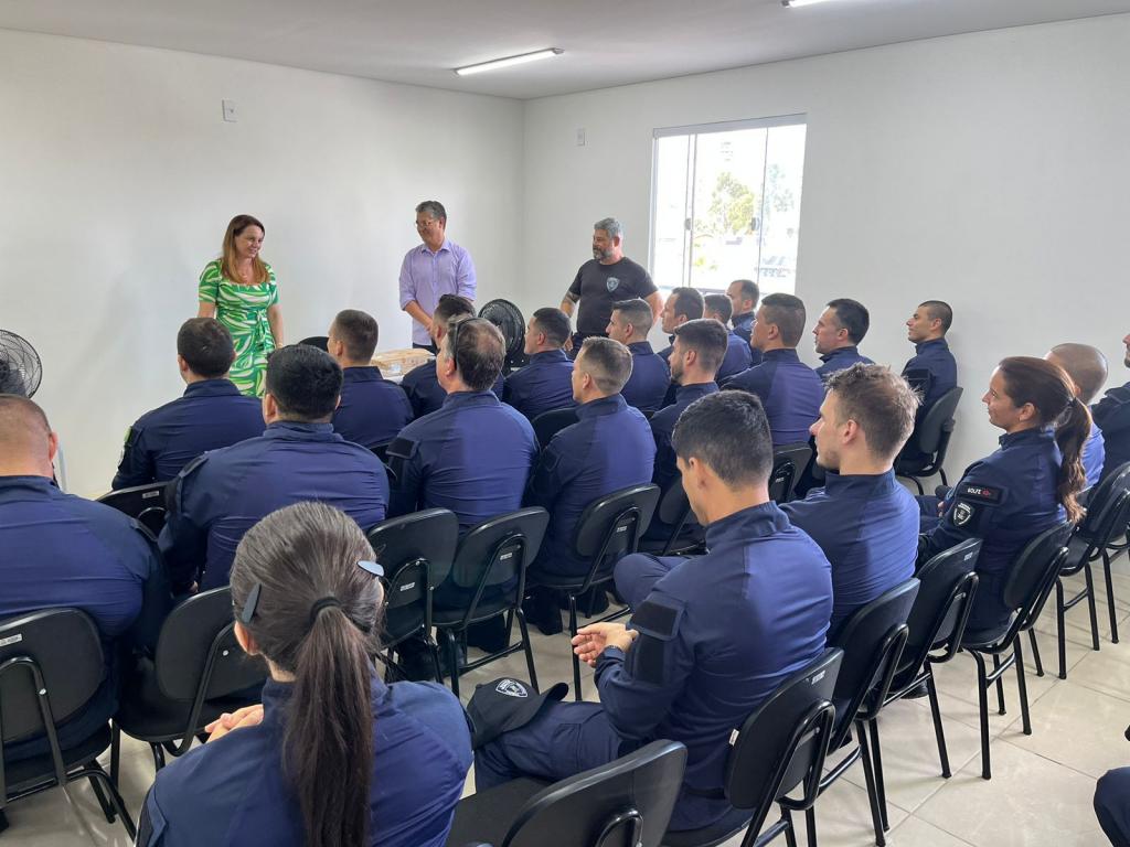 A Prefeita esteve presente na recepção dos novos guardas, acompanhada pelo Secretário de Segurança Pública, Major Rodrigues, e pelo Juiz Marcelo Trevisan Tambosi.