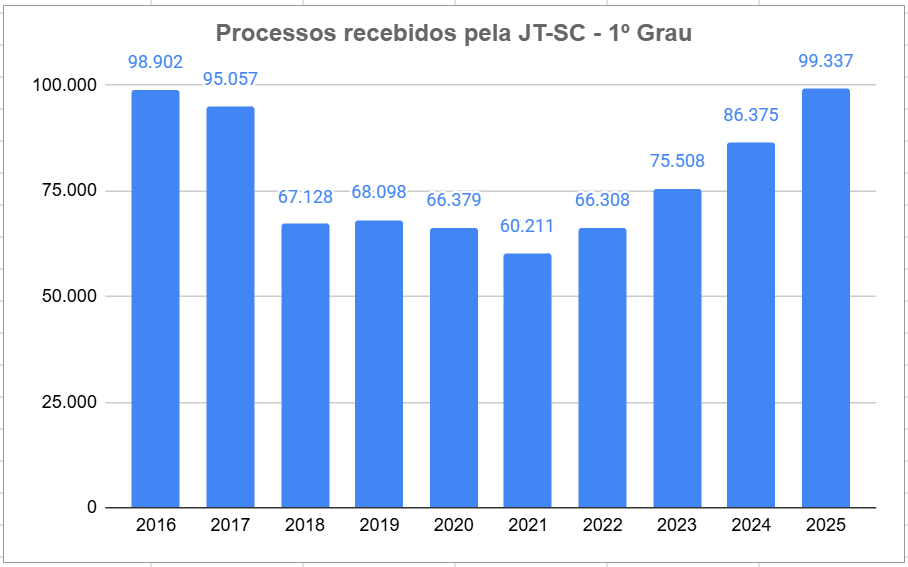 A Justiça do Trabalho de Santa Catarina registrou, em 2025, o maior volume de novos processos trabalhistas de sua história. Ao todo, 99.866 ações deram entrada nas 60 Varas do Trabalho do estado, número recorde em mais de 90 anos da instituição.Os dados são da Secretaria de Governança e Gestão Estratégica do Tribunal Regional do Trabalho da 12ª Região (TRT-SC), com base no sistema e-Gestão, que reúne estatísticas da Justiça do Trabalho em todo o país.