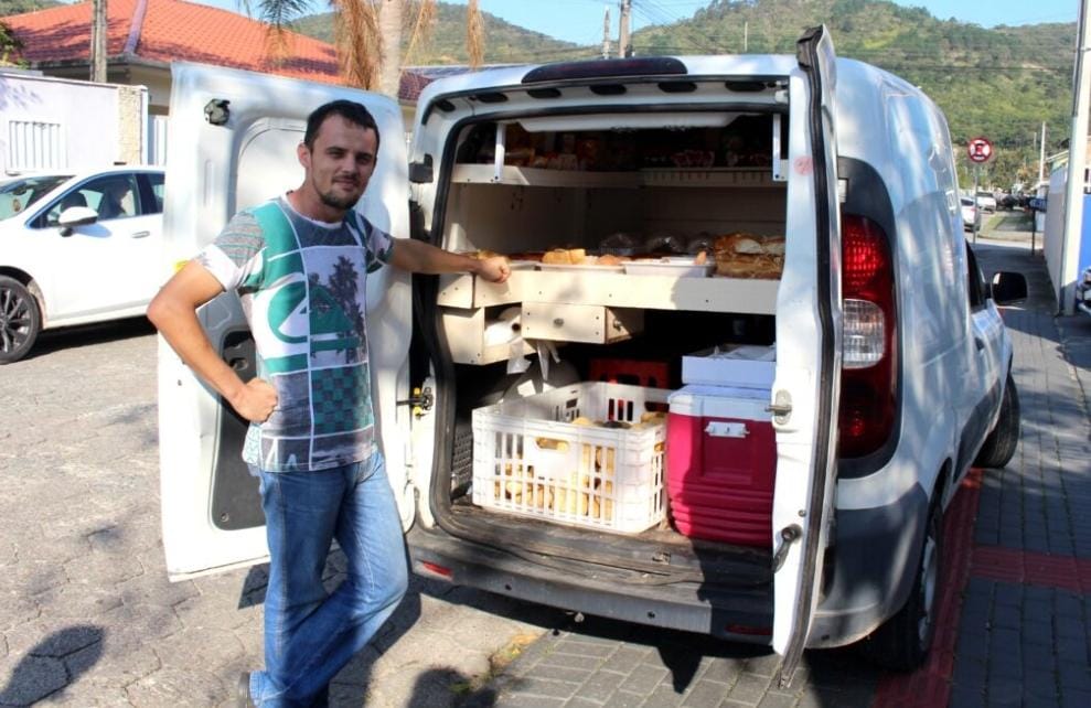 Giovane está sempre à porta do Legislativo só por uns minutos, tempo suficiente para atender a clientela, e já segue em frente. Aos 27 anos, ele leva o pão de cada dia à freguesia, desde o Bairro Araçá até a comunidade do CTG, em um Fiat/Fiorino abarrotado de pães, bolos e guloseimas.