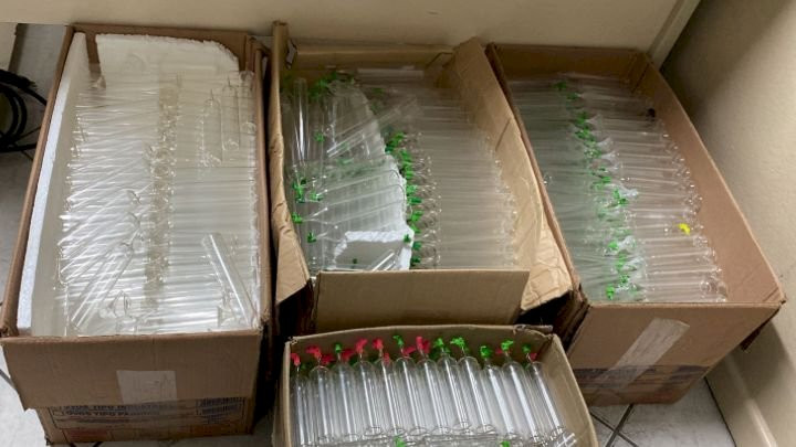 A polícia encontrou uma grande quantidade de material para a fabricação do produto, 197 frascos cheios da droga, 75 latas cheias de gás butano, nove latas de cola acrílica, 13 pacotes com diversos gatilhos acionadores, quatro sacos de elástico para vedação, quatro caixas com diversos frascos vazios e uma balança de precisão.