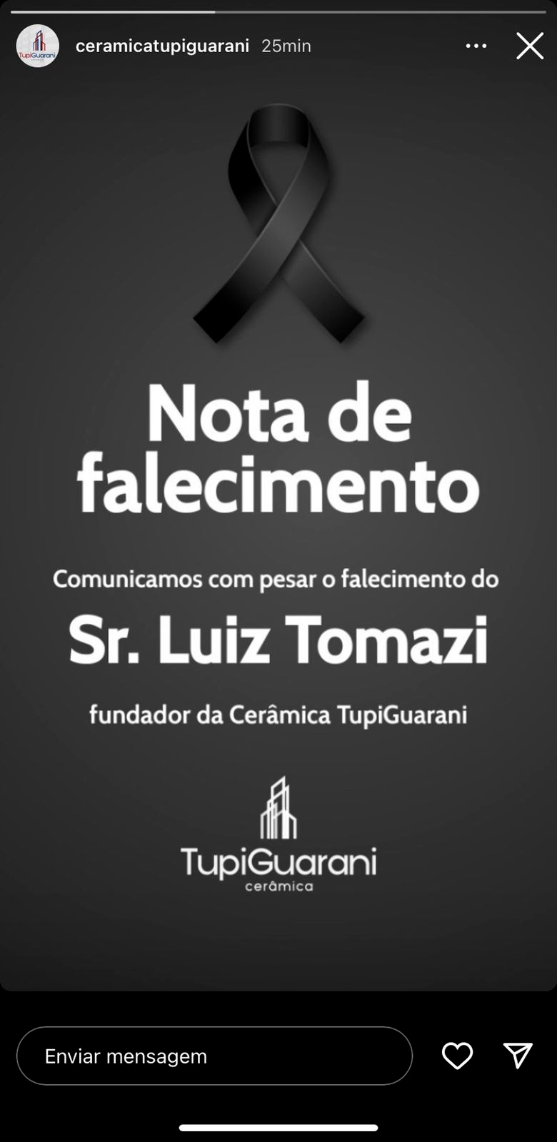 LUTO. O empresário Luiz Tomazi, fundador da Cerâmica TupiGuarani, situada no bairro Nova Descoberta, em Tijucas, faleceu nesta sexta-feira, 29 de julho. A morte foi confirmada através das redes sociais da empresa.