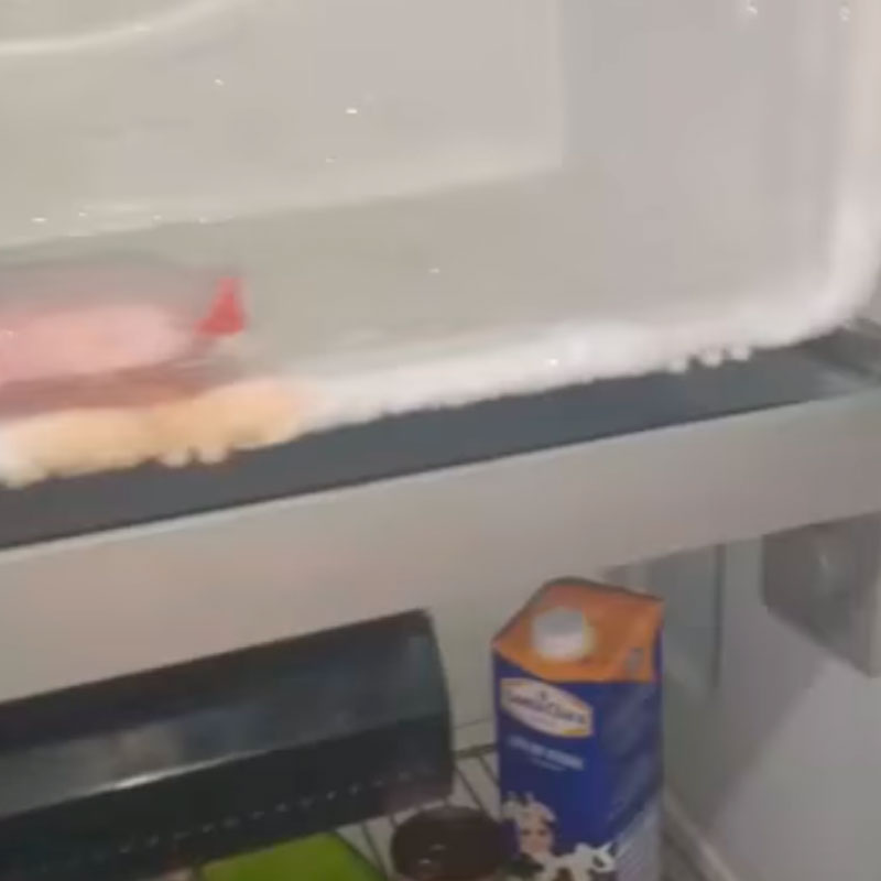 Mãe de dois filhos, uma menina de dois anos e um menino de quatro anos, a mulher mostra o pouco alimento que tem na geladeira. Além da ajuda com doações de alimentos, a família precisa de fralda, roupas e agasalhos para as crianças.