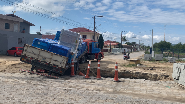 Durante a manhã do último sábado, 12, uma carreta carregada com pisos ficou presa e quase caiu em uma cratera, na esquina com a rua Antônio Apolônio Vargas, enquanto o motorista se deslocava para descarregar o material.