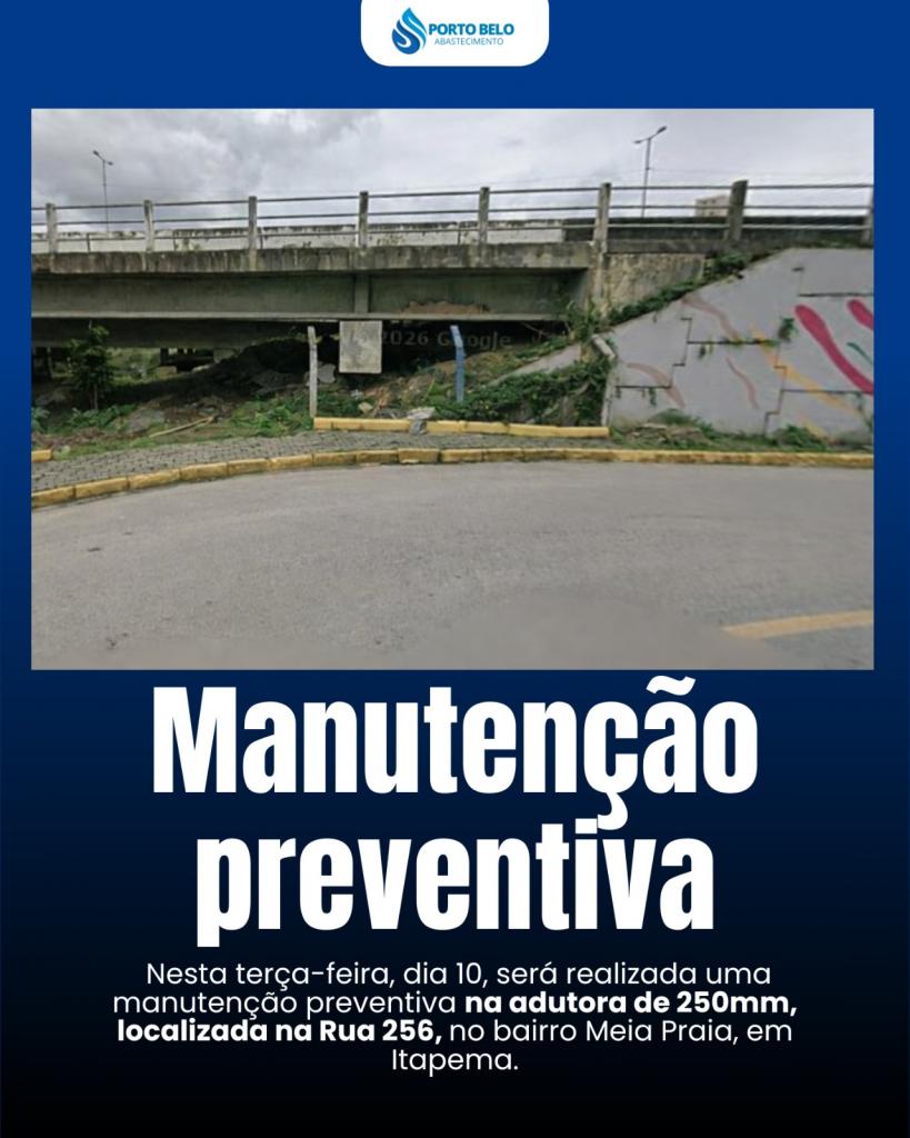 Uma manutenção preventiva será realizada nesta terça-feira, 10 de março, pela Porto Belo Abastecimento em uma adutora de 250mm em Itapema. O serviço que será executado na Rua 256, no bairro Meia Praia, tem como objetivo trocar uma tubulação já desgatada e evitar vazamentos futuros, garantindo asssim mais segurança e eficiência no fornecimento de água à população.