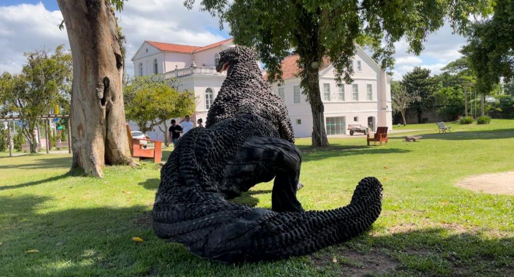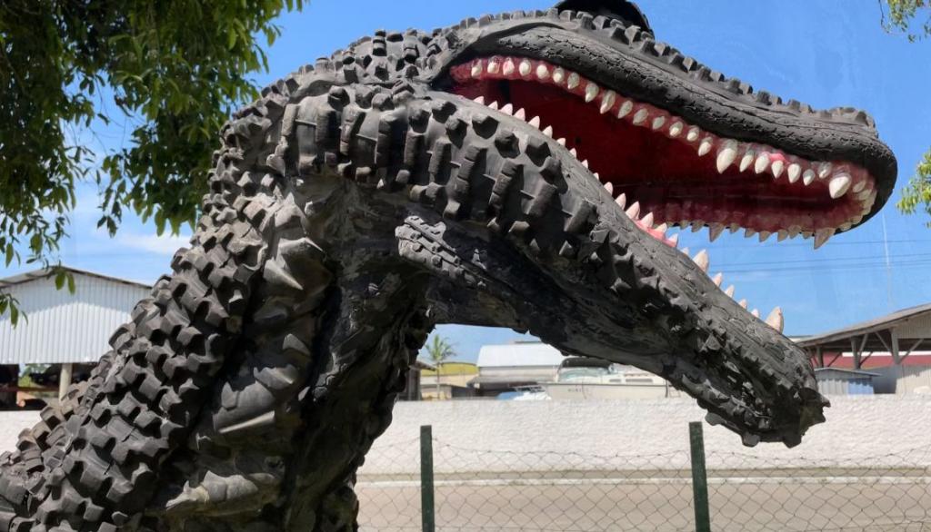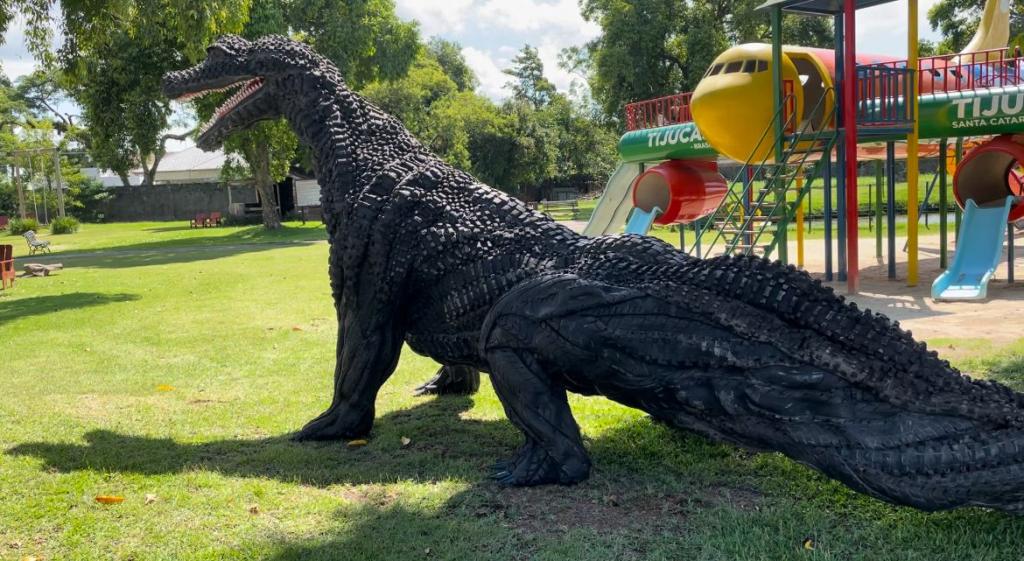 Os Tijuquenses tem agora um nova obra de arte para conhecer. Depois de 5 meses de trabalho, o artista plástico Rafael Zaca entregou hoje a Megalodina, a versão fêmea do dinossauro de Tijucas.