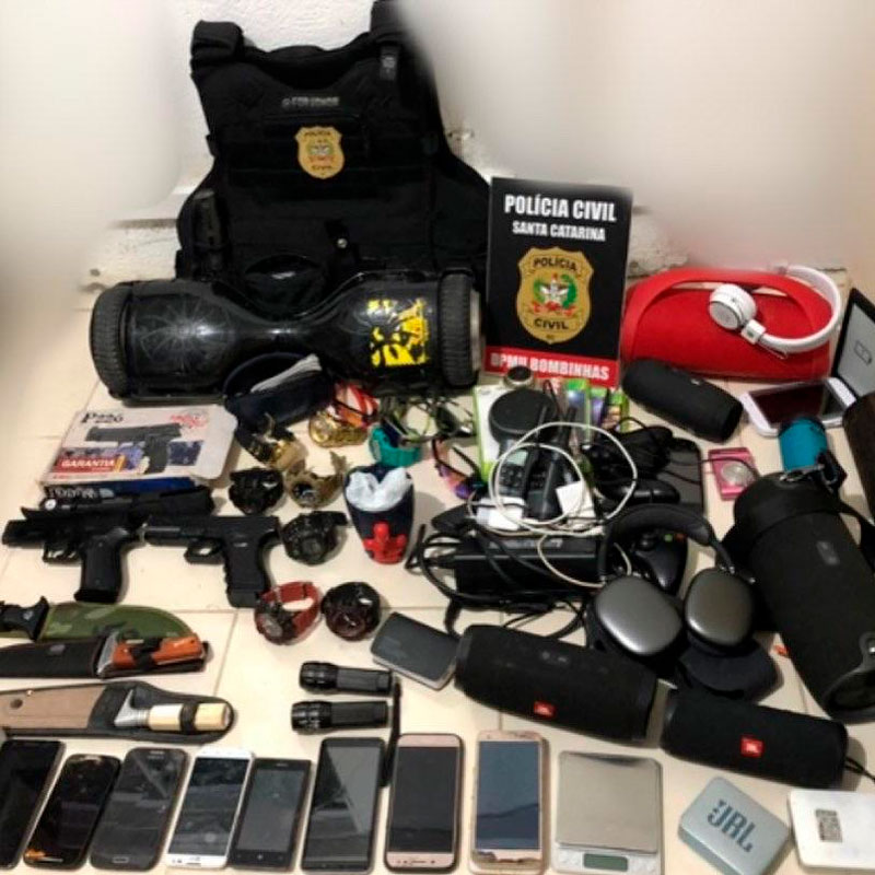 O rapaz foi apreendido no bairro Bombas. Objetos com indício de procedência ilícita foram encontrados, havia vários aparelhos eletrônicos, entre eles relógios, celulares, caixas de som, videogame, além de simulacros de arma de fogo, facas de caça, maconha e balança de precisão usadas para o tráfico.