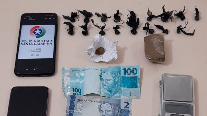 Mais haxixe foi encontrado, pensando cerca de 40 gramas, havia ainda 17 porções de cocaína, material para pesagem dos entorpecentes e R$104 em dinheiro. O celular contento negociações do tráfico foi apreendido para análise.