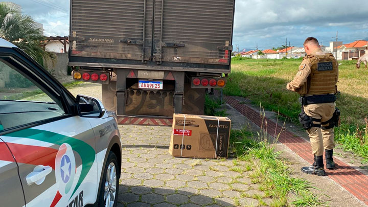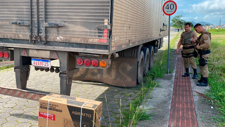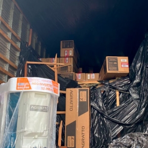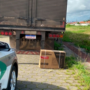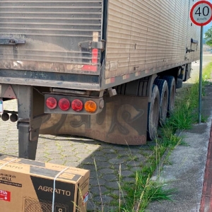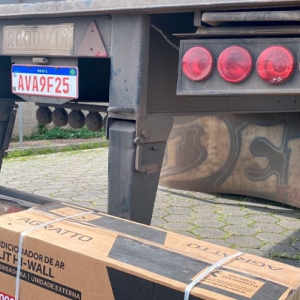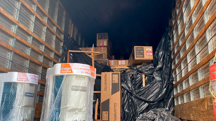 Uma carga de ar condicionado foi abandonada na via. Não havia caminhão, apenas o baú totalmente aberto com a carga dentro.