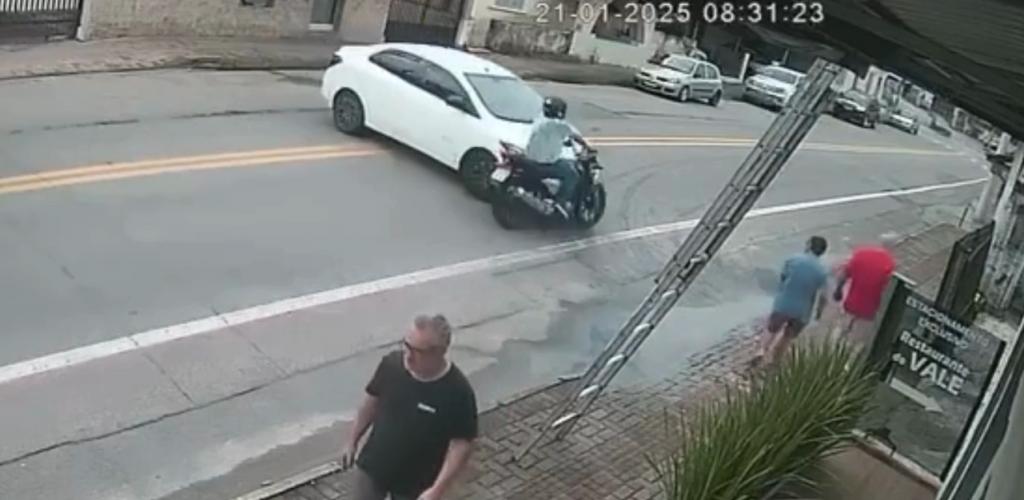 Uma câmera de segurança registrou o acidente. As imagens mostram que o Chevrolet Onix estava estacionado e tentou acessar o sentido contrário em uma manobra proibida, atingindo o motociclista que seguia no sentido Centro-bairro.