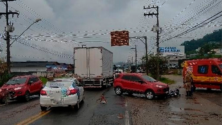 Um acidente envolvendo uma caminhonete e uma motocicleta foi registrado no início da manhã desta quinta-feira, 21 de outubro, na rodovia SC 108, em Brusque.