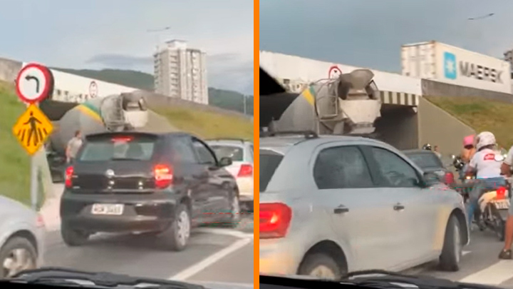Desta vez, um caminhão modelo betoneira ficou preso na estrutura de concreto, mesmo diante da placa indicando tráfego apenas para veículos com até 3,4 metros de altura. A sinalização foi ignorada e houve a colisão.