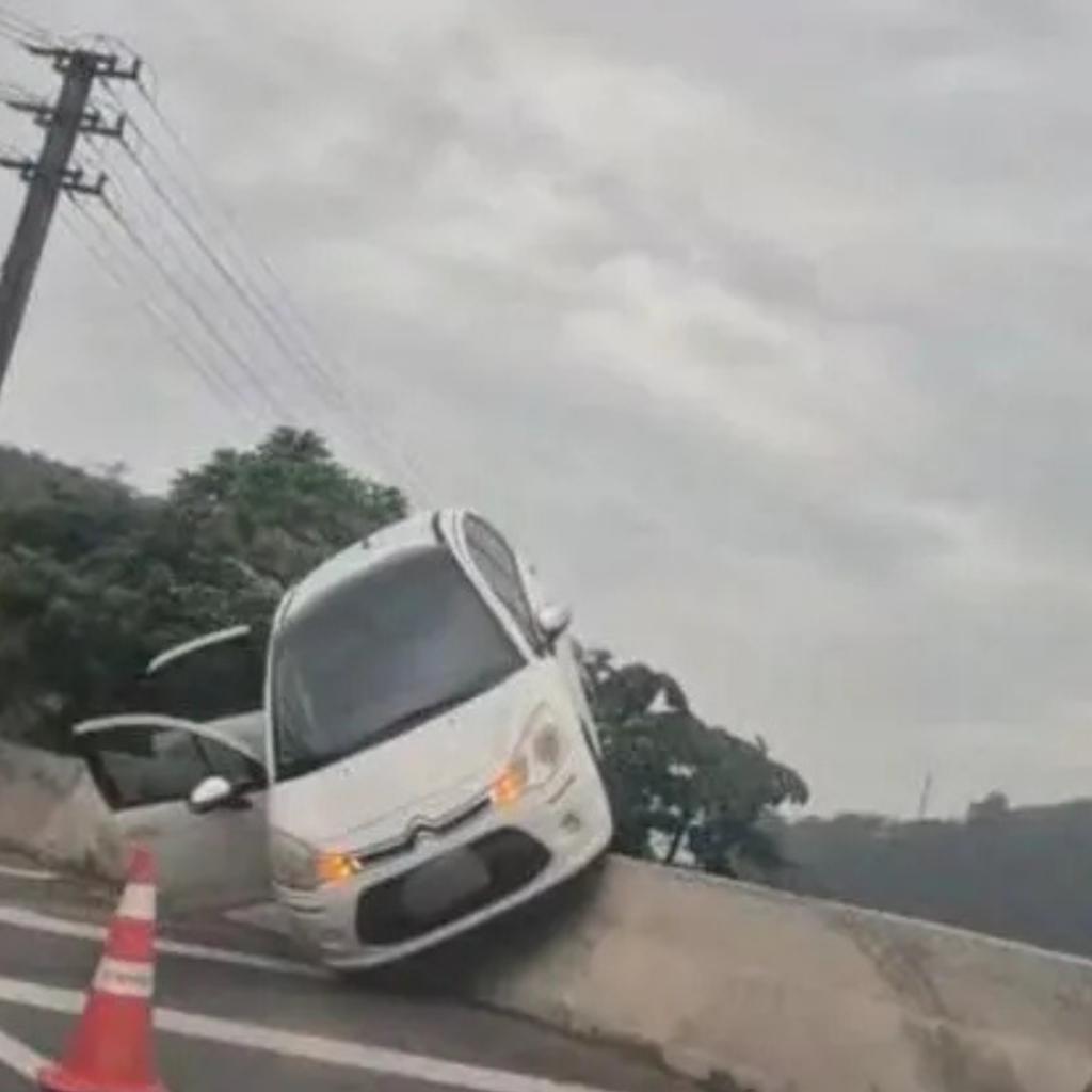 As imagens do acidente impressionam: o veículo ficou com as rodas traseiras no ar, pendurado sobre a mureta. A motorista, que faz semanalmente o trajeto entre Joinville e Florianópolis a trabalho, relatou que estava em baixa velocidade quando percebeu que o carro começou a deslizar.