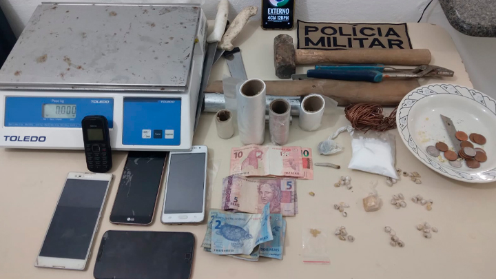 Na casa da mulher, na rua 448, foram apreendidos 06 celulares, uma marreta, um alicate, facas e materiais para embrulhar os entorpecentes. Os envolvidos foram levados para a Delegacia. No local ao ver as drogas sendo pesadas a mulher ficou agressiva e exigiu drogas para consumir. Ao ser negado, ela passou a ameaçar e xingar os policiais com palavras de baixo calão.