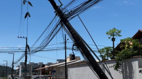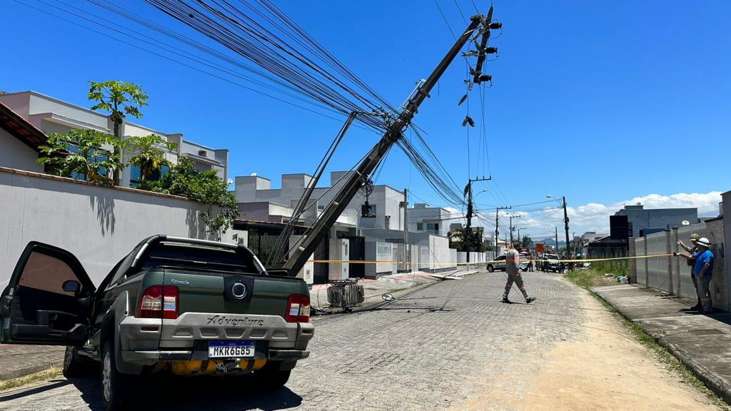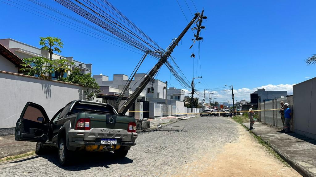 O poste ficou suspenso pelos fios e toda a eletricidade do bairro foi cortada para evitar danos. A previsão é que a energia seja estabelecida somente no fim do dia.