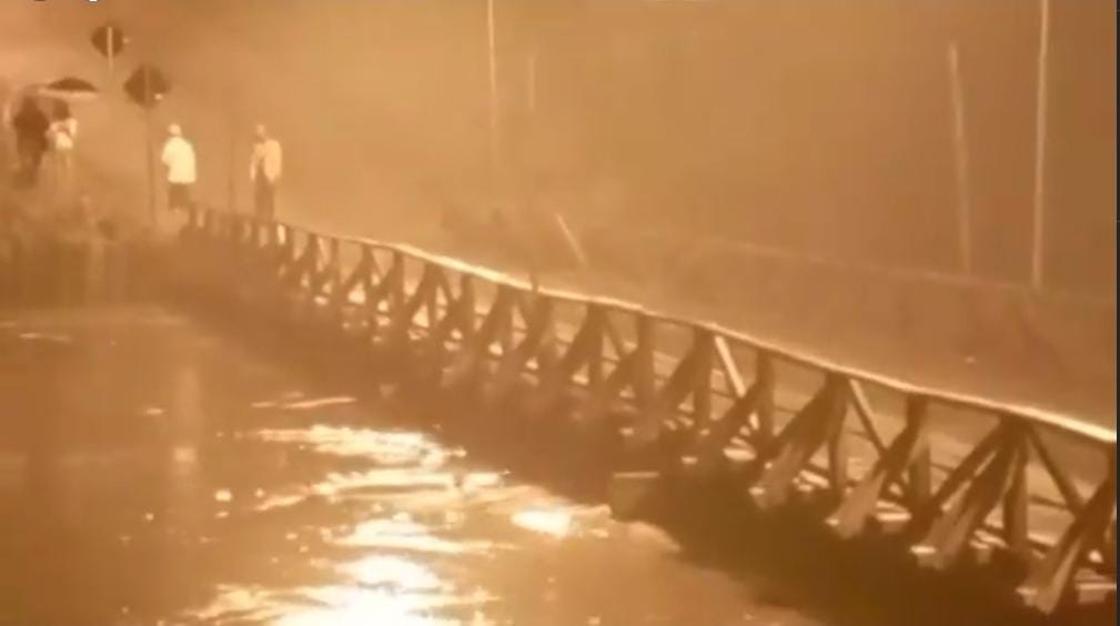 Uma equipe da Defesa Civil e da Secretaria de Obras de São João Batista, monitoram na noite desta quarta-feira, 12 de julho, a situação das chuvas no município, em especial, a estrutura da ponte provisória localizada no Bairro Colônia.