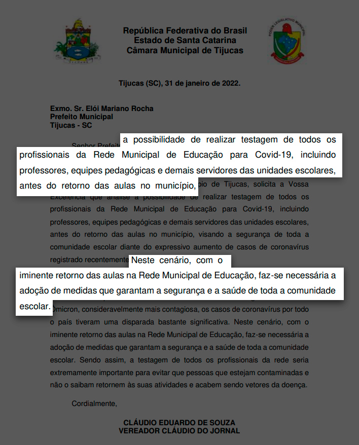 Em Tijucas, o vereador Cláudio Eduardo de Souza protocolou um requerimento solicitando a testagem dos profissionais da educação, especialmente os professores, antes do retorno às classes e ao contato com os estudantes.