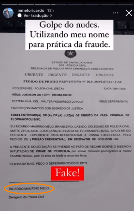É o caso do delegado Ricardo Melo, da Polícia Civil de Bombinhas. Em postagens na sua rede social o delegado da cidade da Costa Esmeralda alertou que seu nome está sendo utilizado na prática desses golpes.