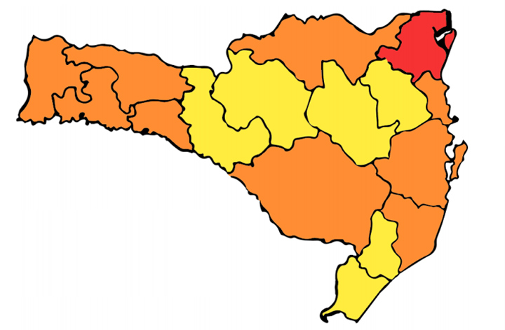 Neste momento, a ocupação máxima de um estabelecimento varia de acordo com o nível de classificação da região no mapa de risco. Conforme a última atualização dos órgãos responsáveis, o Vale do Rio Tijucas e a Costa Esmeralda estão em nível grave, representado no mapa abaixo pela cor laranja.