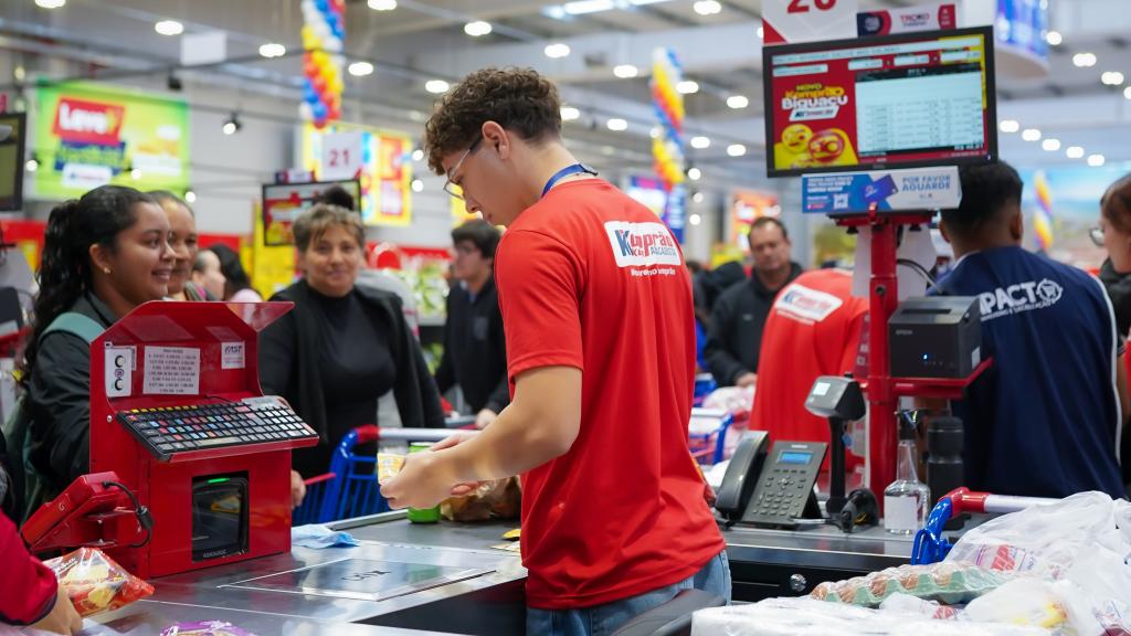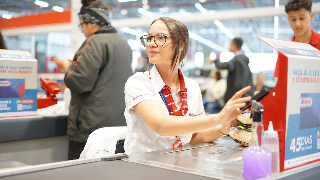 Thalya Diany Perger Pinheiro, conhecida como Lia, trabalha há cerca de 4 meses na frente de caixa. Mãe solo, ela relata que a possibilidade de aceitar jornadas conforme a disponibilidade facilita a organização da rotina familiar.