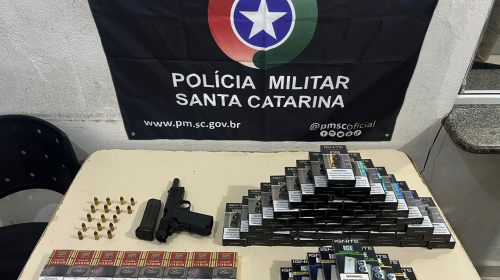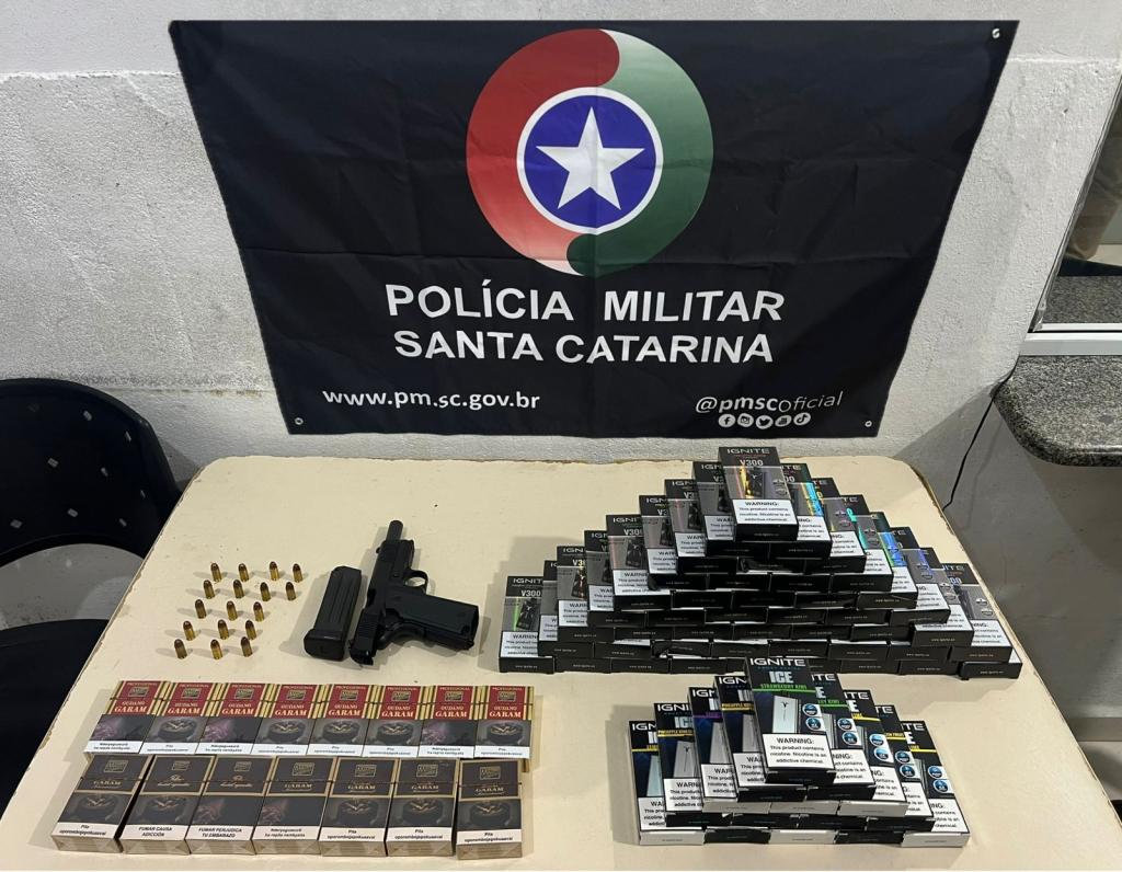 ➡️Em Porto Belo, durante as ações de fiscalização, a Polícia Militar apreendeu uma arma de fogo em um estabelecimento comercial do tipo conveniência. No mesmo local, também foram recolhidos 15 cigarros de origem paraguaia e 58 unidades de cigarro eletrônico.